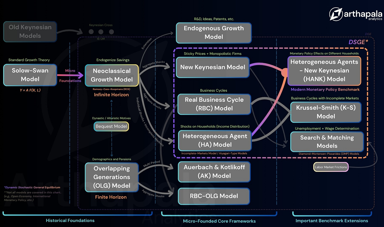These optimization behavior of not only households, but also firms, governments, and other agents marks the transition from older growth models to the broader architecture of modern macro. The diagram below gives a broad roadmap of how these models evolve and connect to the benchmark frameworks used in modern macroeconomics. What follows is a quick tour of some of the most important ones.