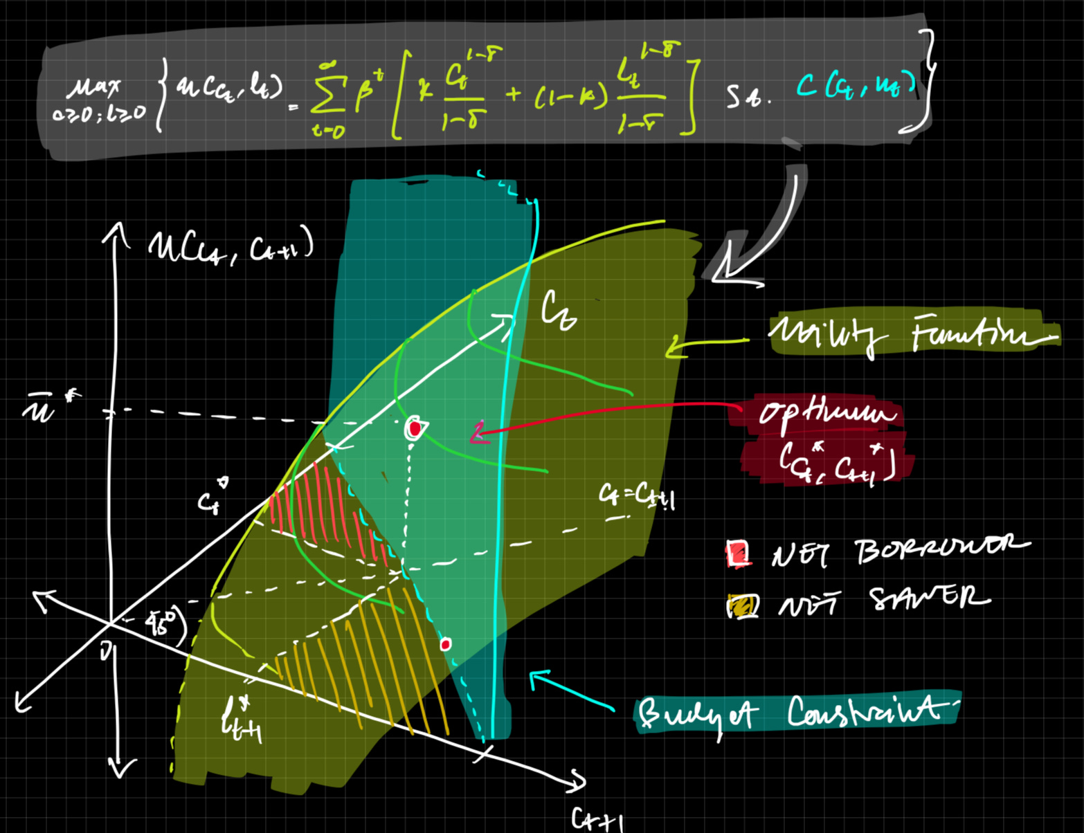 Modern macroeconomics pushes directly on that gap. Instead of taking saving as given, microfoundations ask: how does saving emerge from household decisions? How do people choose between consuming today and saving for tomorrow? Since households do not simply spend everything at once, theorists model that trade-off explicitly through an intertemporal utility maximization problem. In other words, saving is no longer imposed from outside the model; it becomes the result of optimization.